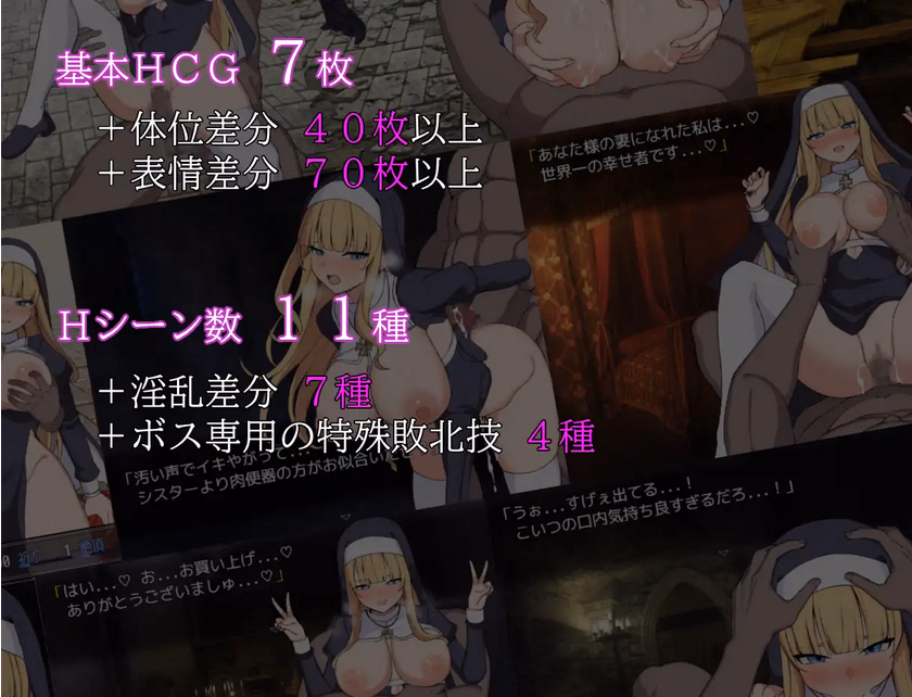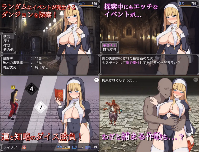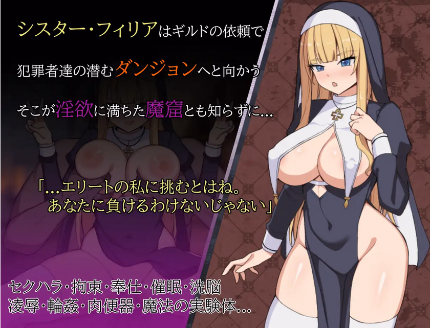 Description: At the request of the Guild, Sister Philia sets out to hunt down a group of dangerous criminals. However, her destination is a dungeon thick with a powerful curse that seals away her greatest weapon: her magic. Forced into a desperate struggle, Philia becomes the target of the depraved men lurking within the den of vice! From Bandits who use brute force to satisfy their whims, to a Pharmacist dealing in aphrodisiacs and human trafficking, and a Mysterious Cult that brainwashes women to follow their every command… Can Philia successfully subjugate the criminals and escape unscathed—or will she fall to the depths of the dungeon?!